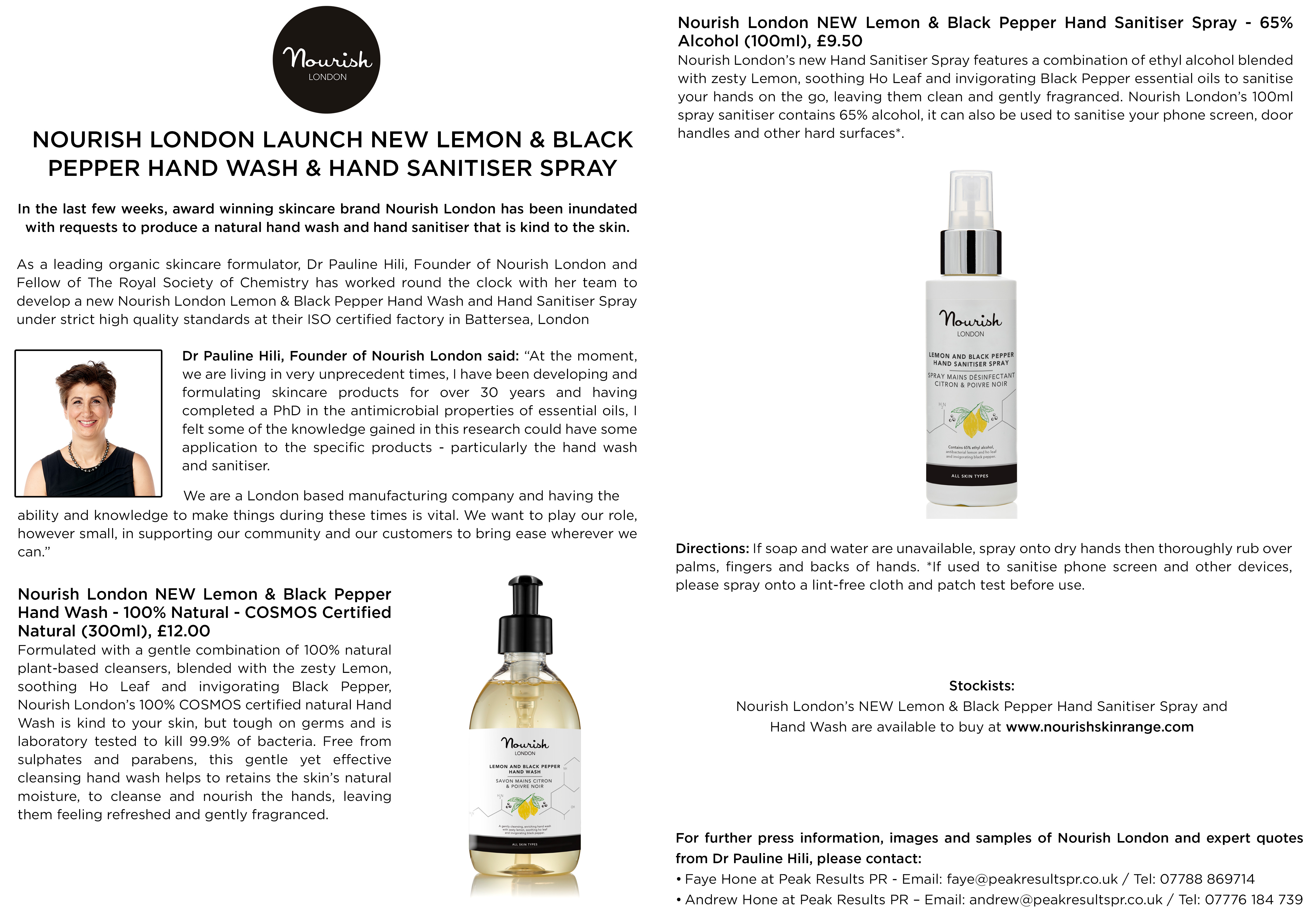 Award winning organic and vegan skincare brand Nourish London has launched a new Lemon & Black Pepper Hand Wash & Hand Sanitiser Spray.